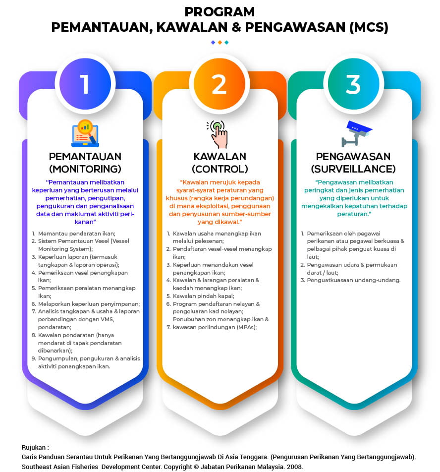 Perlaksanaan program MCS adalah bagi memastikan pematuhan kepada AKTA PERIKANAN 1985, peraturan dan syarat lesen perikanan serta instrumen antarabangsa seperti FAO Code Of Conduct For Responsible Fisheries (CCRF), 1995.